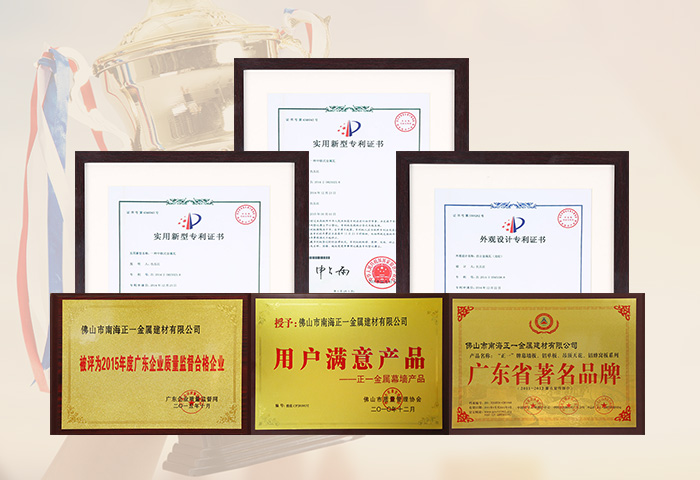 通過ISO9001認證,國家建筑材料測試中心和中國有色金屬華南產品質量監(jiān)督檢驗中心合格檢測,符合美國建筑制造商協(xié)會AAMA2605-98涂層標準,被國家建設部認定為建筑鋁合金外墻板、鋁合金天花板定點生產企業(yè)。